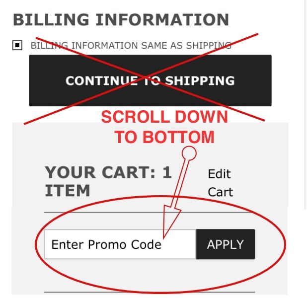 Phone Shoppers - You must scroll all the way down after entering your billing information. DO NOT Click the Continue to Shipping Button; keep scrolling to find the Promo Code Box. After you enter and apply your promo code, scroll back up and click Continue to Shipping. (See Image)